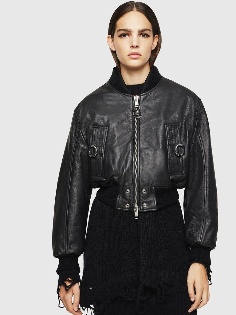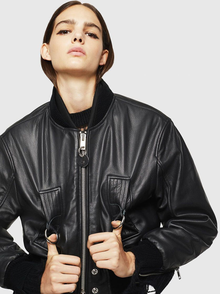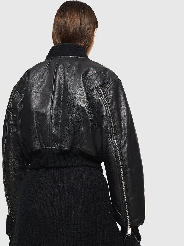 Boxy bomber jacket in textured grained leather. The style is defined by extra-long zips running down the back of the sleeves. Chunky metal rings accentuate the pockets.