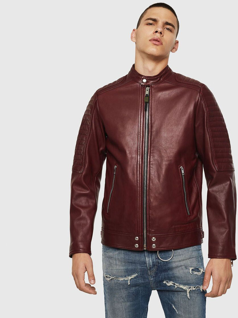 This leather biker jacket is made from washed sheepskin. Stitching and padding on the sleeves and zip pull complete the style.