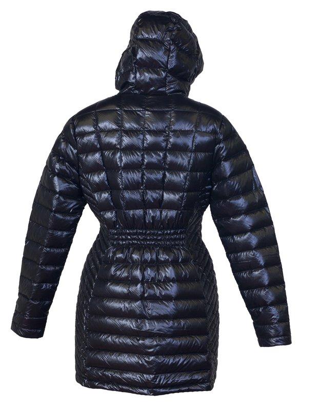 32” shiny nylon pack down parka with hood features two way zip front closure, two lower on seam zip pockets and multi panel quilted details. 90/10 down fill.